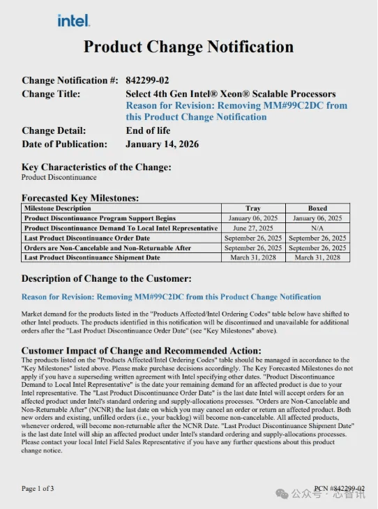 值得注意的是,英特尔随后更新了停产清单,将Xeon Gold 6414U 从EOL 名单中移除,确认该型号仍继续保持供货。
