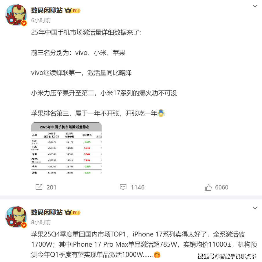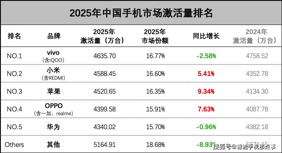 但没有想到的是,近期有博主公布了2025年中国手机市场年度激活量排行榜,这份基于运营商底层激活数据的榜单非常真实和残酷。
